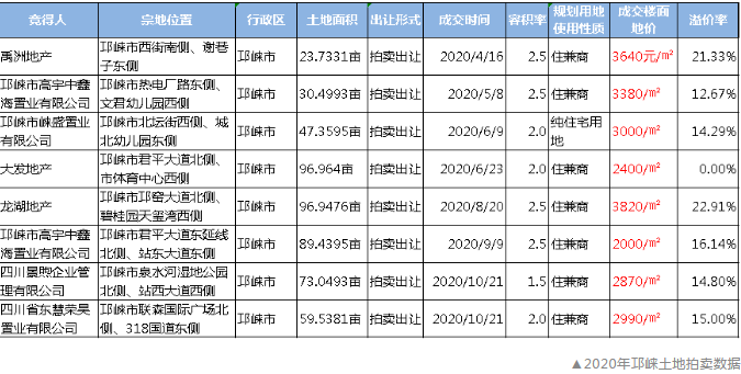 ②、邛崃2020年土拍数据(下图来自四川乐居)