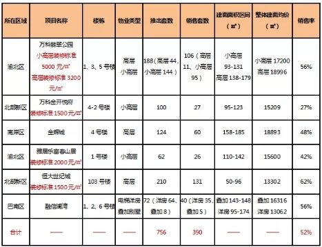上周依据重庆日报地产公众号披露数据,上周住宅备案数据仅为24.21万方。市场低迷。在其监控的6个新开楼盘中,平均去化率为52%。