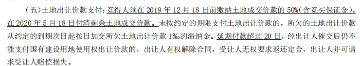 值得关注的是,本次土地出让条件中,付款条件有一定的松动,允许拿地企业一个月内付清50%,6个月之内付清剩余的50%。